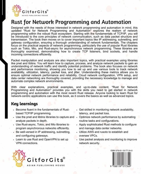 Designed with the needs of those interested in network programming and automation in mind, this updated "Rust for Network Programming and Automation" explores the realism of network programming using Rust 1.68. The book covers important topics like IP addressing, subnetting, and gateway configuration, ensuring a thorough understanding of network fundamentals. The chapters cover the use of popular Rust libraries such as Tokio, Mio, and Rust-async for asynchronous network programming. These libraries are thoroughly examined, demonstrating how to create TCP listeners, bind sockets, and handle incoming connections efficiently. Packet manipulation and analysis are also important topics, with practical examples using libraries like pnet and libtins. You will learn how to capture, process, and analyze network packets to gain an understanding of network traffic and identify potential problems. The book also focuses on network and performance monitoring, showing you how to set up and use various tools to track network availability, utilization, latency, packet loss, and jitter. Understanding these metrics allows you to ensure optimal network performance and reliability. Cloud network configuration, VPN setup, and data center networking are thoroughly covered, providing the necessary knowledge to manage and automate complex network environments. Key LearningsBecome fluent in the fundamentals of Rust-based TCP/IP programming. Use the pnet and libtins libraries to capture and analyze packets in depth. Use the Rust-async, Tokio, and Mio libraries to program asynchronous networks efficiently. Be well-versed in IP addressing, subnetting, and configuring gateways to assure a secure network installation. Learn to use Rust and OpenVPN to set up VPN connections and monitoring network availability, latency, and packet loss. Use packet analysis and monitoring to improve network security by identifying threats.