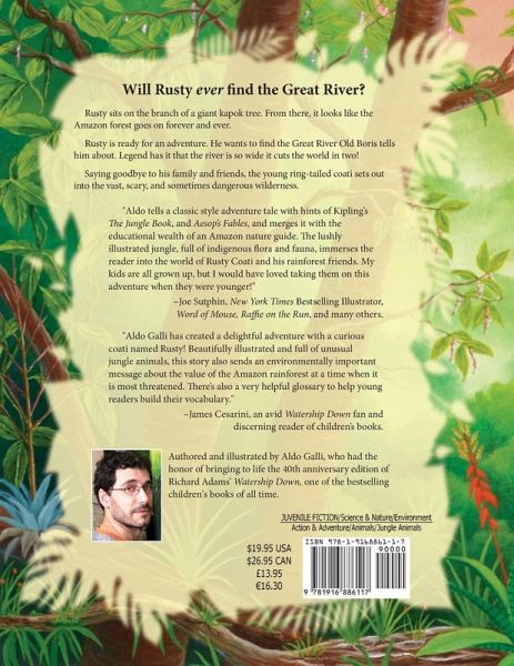 "AND FAR BEYOND THIS VALLEY," BORIS BORED HOLES INTO RUSTY'S EYES, "LIE WONDERS YOU CANNOT IMAGINE. LEGEND SAYS THERE IS A GREAT RIVER―A RIVER SO WIDE IT CUTS THE WORLD IN TWO!" In the opening story of the Rusty Coati series, a young Rusty and his friends enjoy an easygoing life in the safety of their secluded valley, until one day Old Boris tells them the legend of the Great River. Everybody believes that the elder coati is crazy, as no one knows his secret. Only Rusty perceives that the bearer of all the knowledge of the forest has an important message to pass on to youngsters and is looking for someone curious and brave, willing to find the truth. From a branch of the giant kapok tree, Rusty looks out over the immense Amazon rainforest with excitement: he is ready for an adventure! The courageous ring-tailed coati sets out on a journey in search of the Great River. Along the way, Rusty makes new friends between the jungle animals, and they help him to overcome the many obstacles he encounters in what seems an impossible quest. Will Rusty ever find the Great River and understand the real meaning of the ancient tale? Will he make it back to his valley to share it with the other coatis? ABOUT THE RUSTY COATI STORIES Inspired and encouraged by his close friend, the late Richard Adams―author of Watership Down, one of the most beloved and bestselling children's novels of all times―Galli has created his own set of animal characters and adventures, with a rather peculiar protagonist: Rusty, the ring-tailed coati, a funny-looking creature, with a long snout and black and white markings on his face. The books are beautifully crafted and contain the original artwork based on Galli's travel and experiences in the Peruvian Amazon, studying native wildlife and plants and finding the inspiration for the series. Like in the Watership Down's 40th anniversary commemorative edition he had the honor of illustrating, the stories come to life in detailed and vibrant oil paintings on canvas, designed to transport young readers into Rusty's world and fire their imagination. With many additional facts about the Amazon jungle, the books are great educational tools for parents and teachers to help children discover its beauty and treasures and understand the importance of this place and why we must protect it. The series not only aims to offer charming tales to entertain kids but also wants to engage with a young audience about the environment and the natural world and seeks to raise awareness about the Amazon. This is a time when the rainforest needs all our help to preserve it for its unique animals and plants, for all the indigenous people who call it home, and for the future of our planet.