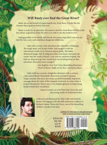 "AND FAR BEYOND THIS VALLEY," BORIS BORED HOLES INTO RUSTY'S EYES, "LIE WONDERS YOU CANNOT IMAGINE. LEGEND SAYS THERE IS A GREAT RIVER¿A RIVER SO WIDE IT CUTS THE WORLD IN TWO!" In the opening story of the Rusty Coati series, a young Rusty and his friends enjoy an easygoing life in the safety of their secluded valley, until one day Old Boris tells them the legend of the Great River. Everybody believes that the elder coati is crazy, as no one knows his secret. Only Rusty perceives that the bearer of all the knowledge of the forest has an important message to pass on to youngsters and is looking for someone curious and brave, willing to find the truth. From a branch of the giant kapok tree, Rusty looks out over the immense Amazon rainforest with excitement: he is ready for an adventure! The courageous ring-tailed coati sets out on a journey in search of the Great River. Along the way, Rusty makes new friends between the jungle animals, and they help him to overcome the many obstacles he encounters in what seems an impossible quest. Will Rusty ever find the Great River and understand the real meaning of the ancient tale? Will he make it back to his valley to share it with the other coatis? ABOUT THE RUSTY COATI STORIES Inspired and encouraged by his close friend, the late Richard Adams¿author of Watership Down, one of the most beloved and bestselling children's novels of all times¿Galli has created his own set of animal characters and adventures, with a rather peculiar protagonist: Rusty, the ring-tailed coati, a funny-looking creature, with a long snout and black and white markings on his face. The books are beautifully crafted and contain the original artwork based on Galli's travel and experiences in the Peruvian Amazon, studying native wildlife and plants and finding the inspiration for the series. Like in the Watership Down's 40th anniversary commemorative edition he had the honor of illustrating, the stories come to life in detailed and vibrant oil paintings on canvas, designed to transport young readers into Rusty's world and fire their imagination. With many additional facts about the Amazon jungle, the books are great educational tools for parents and teachers to help children discover its beauty and treasures and understand the importance of this place and why we must protect it. The series not only aims to offer charming tales to entertain kids but also wants to engage with a young audience about the environment and the natural world and seeks to raise awareness about the Amazon. This is a time when the rainforest needs all our help to preserve it for its unique animals and plants, for all the indigenous people who call it home, and for the future of our planet.