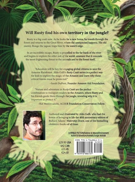 RUSTY STARED AT HIS DISTANT HOMELAND FROM THE BANK. "I HAVE JUST CROSSED THE GREAT RIVER!" HE SHOUTED. "WILL I FIND A TERRITORY? COULD THIS PART OF THE WORLD BE MY FOREVER HOME?" Rusty is a big coati now. As he looks for a new home, he travels through the forest and returns to the Great River, where the unexpected happens. His old enemy, Rongo the jaguar, traps him by the water's edge. In an incredible escape, Rusty is propelled to the far bank of the river and begins to explore the other side of the world, unaware that it conceals the most frightening threat to the animals and to the forest itself. ABOUT THE RUSTY COATI STORIES Inspired and encouraged by his close friend, the late Richard Adams¿author of Watership Down, one of the most beloved and bestselling children's novels of all times¿Galli has created his own set of animal characters and adventures, with a rather peculiar protagonist: Rusty, the ring-tailed coati, a funny-looking creature, with a long snout and black and white markings on his face. The books are beautifully crafted and contain the original artwork based on Galli's travel and experiences in the Peruvian Amazon, studying native wildlife and plants and finding the inspiration for the series. Like in the Watership Down's 40th anniversary commemorative edition he had the honor of illustrating, the stories come to life in detailed and vibrant oil paintings on canvas, designed to transport young readers into Rusty's world and fire their imagination. With many additional facts about the Amazon jungle, the books are great educational tools for parents and teachers to help children discover its beauty and treasures and understand the importance of this place and why we must protect it. The series not only aims to offer charming tales to entertain kids but also wants to engage with a young audience about the environment and the natural world and seeks to raise awareness about the Amazon. This is a time when the rainforest needs all our help to preserve it for its unique animals and plants, for all the indigenous people who call it home, and for the future of our planet.