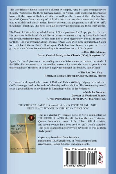 This user-friendly double volume is a chapter-by-chapter, verse-by-verse commentary on the only two books of the Bible that were named for women: Ruth and Esther. Information from both the books of Ruth and Esther, as well as other books of the Bible has been included. Quotes from a variety of biblical scholars and secular sources have also been used to explain and clarify ancient history, customs, and geography, as well as to verify the authors' narratives. This book is suitable for private devotions and Bible study groups. The Book of Ruth tells a wonderful story of God's provision for His people. In it, we see His provision for Ruth and Naomi. But as this new commentary by my friend Paula Oneal will reveal, behind the details of this story lies an even bigger story. For in His provision for Ruth, God was providing a king for Israel (David), and even more importantly, a Savior for His Church (Jesus Christ). Once again, Paula has done believers a great service in giving us a useful tool for understanding this marvelous story of God's grace. -Rev. Mike Moreau, Pastor, Central Presbyterian Church (PCA), Kingstree, SC. Again, Dr. Oneal gives us an outstanding source of information to continue our study of the Bible. This commentary is an excellent resource for those who want to grow in their understanding of the Book of Esther. I highly recommend this book by Paula Oneal. -The Rev. Bert Daly, Rector, St. Mark's Episcopal Church, Starke, Florida Dr. Paula Oneal unpacks the books of Ruth and Esther skillfully, helping the reader see God's sovereign hand in the midst of adversity and bad choices. This commentary would act as a good addition to any library in furthering studies of the Redeemer. -Nicholas Sommer, Director of Youth and Family, Grace Presbyterian Church (PCA), Blairsville, Ga. THE CHRISTIAN AUTHOR AWARDS BOOK CONTEST FALL 2019: FIRST PLACE WINNER IN CHRISTIAN THEOLOGY This is a chapter-by- chapter, verse-by-verse commentary on THE BOOK OF ACTS, the fifth book of the New Testament. Quotes from other books of the Bible, biblical scholars, and secular sources have been used to verify Luke's narrative. This book is appropriate for private devotions as well as Bible study groups. Copies may be ordered from the author, paulamoneal1952@gmail.com, or from xulonpress.com, amazon.com, Barnes & Noble, and Apple iBooks.