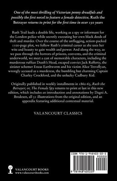 One of the most thrilling of Victorian penny dreadfuls and possibly the first novel to feature a female detective, Ruth the Betrayer returns to print for the first time in over 150 years Ruth Trail leads a double life, working as a spy or informant for the London police while secretly executing her own black deeds of theft and murder. Over the course of the unflagging, action-packed 1100-page plot, we follow Ruth’s criminal career as she uses her wits and beauty to gain wealth and power. Along the way, as we pass through the horrors of prisons, convents, and the criminal underworld, we meet a cast of memorable characters, including the murderous ruffian Death’s Head, escaped convict Jack Rafferty, the sinister schemer Eneas Earthworm and his victim Alice Trevellyan, wrongly accused as a murderess, the bumbling but charming Captain Charley Crockford, and the unlucky Cadbury Kid. Originally published in weekly installments in 1862-63, Ruth the Betrayer; or, The Female Spy returns to print at last in this new edition, which includes an introduction and annotations by Dagni¿A. Bredesen, all 51 illustrations from the original edition, and an appendix featuring additional contextual material.