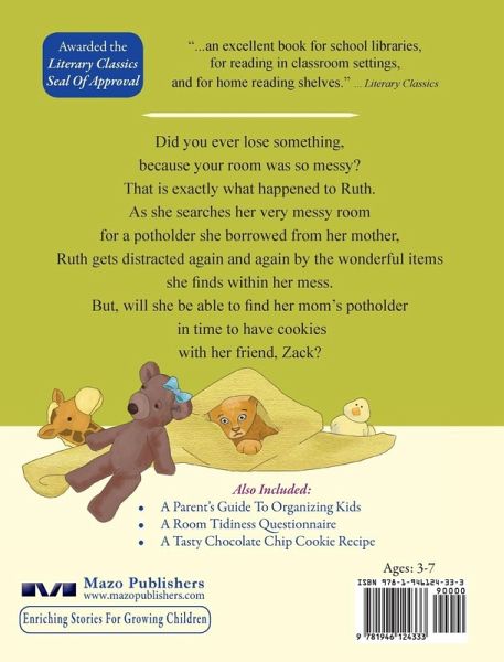 'Ruth the Sleuth and the Messy Room' was selected by Literary Classics to receive their 'Seal of Approval'. This is the story of Ruth, a little girl who is so accustomed to foraging through the clutter in her room that she has become quite adept at finding things in the midst of her messiness. When she loses her mother's oven mitt, she is given a deadline; By the time the chocolate chip cookies in the oven are done baking, the oven mitt must be returned. No problem for Ruth because, as she says, she is "Ruth the Sleuth" and can find anything. As Ruth searches for the oven mitt, she discovers other treasures that had been lost in the chaos of her room. As the minutes tick away, it becomes clear to Ruth that being organized might have its advantages. As her desire to play outside with her friend becomes more and more acute, she resolves to keep her room more tidy. Includes a parental guide with creative ideas for motivating and encouraging children to be neat and nice. Also included is a tasty recipe for chocolate chip cookies. This book has lots to offer for children, parents and educators.