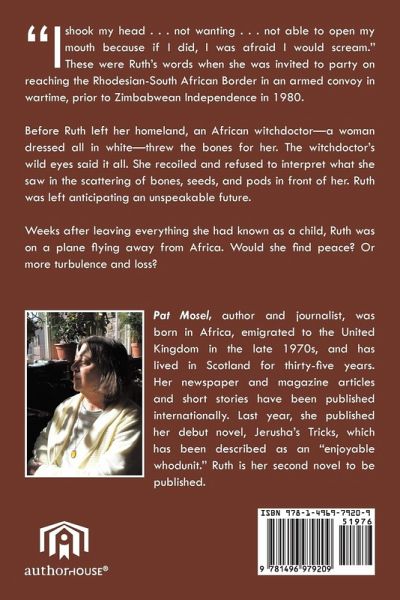 "I shook my head . . . not wanting . . . not able to open my mouth because if I did, I was afraid I would scream." These were Ruth's words when she was invited to party on reaching the Rhodesian-South African Border in an armed convoy in wartime, prior to Zimbabwean independence in 1980. Before Ruth left her homeland, an African witch doctor-a woman dressed all in white-threw the bones for her. The witch doctor's wild eyes said it all. She recoiled and refused to interpret what she saw in the scattering of bones, seeds, and pods in front of her. Ruth was left anticipating an unspeakable future. Living in the Scottish Borders years later, married to the devious and hardhearted Max, who subjects her to psychological abuse, Ruth faces both the disintegration of her marriage and the death of her husband. She will have to leave the marital home in its idyllic setting . . . "leave all that is familiar and all that belongs in places, in corners of a room." She had done this before-lost an environment and a history.