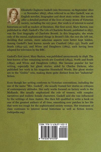 Elizabeth Cleghorn Gaskell, also known as Mrs Gaskell, was an English author, biographer, and short story writer. Her stories provide a vivid image of many levels of Victorian society, including the very impoverished. Her debut work, Mary Barton, was published in 1848. The first biography of Charlotte Bronte was The Life of Charlotte Bronte by Elizabeth Gaskell, published in 1857. In her biography, she wrote solely about the moral and sophisticated portions of Bronte's life; the rest she left out, concluding that some, more lurid aspects were better kept buried. Gaskell's best-known novels include Cranford (1851-1853), North and South (1854-1855), and Wives and Daughters (1864-1866), all of which were adapted for television by the BBC. Gaskell was born Elizabeth Cleghorn Stevenson on September 29, 1810, in Lindsey Row, Chelsea, London (now 93 Cheyne Walk). Her father, William Stevenson, a Unitarian from Berwick-upon-Tweed, was preacher at Failsworth, Lancashire, but resigned on ethical reasons. He traveled to London in 1806 with the aim of heading to India after being appointed private secretary to the Earl of Lauderdale, who would later become Governor General of India.