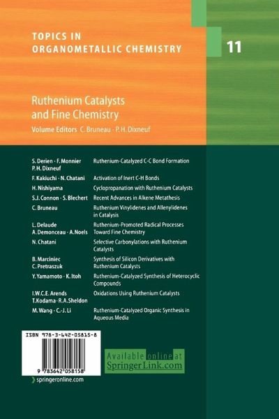 S. Dérien, F. Monnier and P.H. Dixneuf: Ruthenium-Catalyzed C-C Bond Formation.- F. Kakiuchi, N. Chatani: Activation of Inert C-H Bonds.- H. Nishiyama: Cyclopropanation with Ruthenium Catalysts.- S.J. Connon, S. Blechert: Recent Advances in Alkene Metathesis.- C. Bruneau: Ruthenium Vinylidenes and Allenylidenes in Catalysis.- L. Delaude, A. Demonceau and A.F. Noels: Ruthenium-Promoted Radical Processes Toward Fine Chemistry.- N. Chatani: Selective Carbonylations with Ruthenium Catalysts.- B. Marciniec, C. Pretraszuk: Synthesis of Silicon Derivatives with Ruthenium Catalysts.- Y. Yamamoto, K. Itoh: Ruthenium-Catalyzed Synthesis of Heterocyclic Compounds.- I.W.C.E. Arends, T. Kodama and R.A. Sheldon: Oxidations Using Ruthenium Catalysts.- M. Wang, C.-J. Li: Ruthenium-Catalyzed Organic Synthesis in Aqueous Media