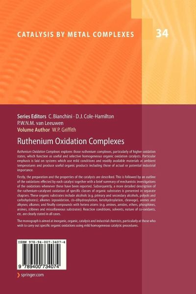 Ruthenium Oxidation Complexes explores ruthenium complexes, particularly those in higher oxidation states, which function as useful and selective organic oxidation catalysts. Particular emphasis is placed on those systems which are of industrial significance. The preparation, properties and applications of the ruthenium complexes are described, followed by a presentation of their oxidative properties and summary of the different mechanisms involved in the organic oxidations (e.g. oxidations of alcohols, alkenes, arenes and alkynes, alkanes, amines, ethers, phopshines and miscellaneous substrates). Moreover, future trends and developments in the area are discussed.