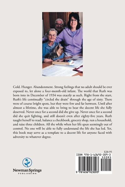 Cold. Hunger. Abandonment. Strong feelings that no adult should be ever exposed to, let alone a four-month-old infant. The world that Ruth was born into in December of 1934 was exactly as such. Right from the start, Ruth's life continually "circled the drain" through the age of sixty. There were of course bright spots, but they were few and far between. Until after almost a lifetime, she was able to bring to bear the decent life she fully deserved. Never once for a second did she give up. Never once for a second did she quit fighting, and still doesn't even after eighty-five years. Ruth taught herself to read, balance a checkbook, grocery shop, run a household, and raise three children. All the while when her life spun seemingly out of control. No one will be able to fully understand the life she has led. Yet, this book may serve as a template to a decent life for anyone faced with adversity to whatever degree.