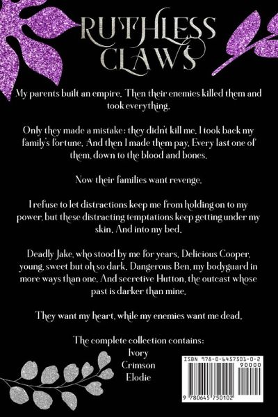 My parents built an empire. Then their enemies killed them and took everything. Only they made a mistake; they didn't kill me. I took back my family's fortune. And then I made them pay. Every last one of them, down to the blood and bones. Now their families want revenge. I refuse to let distractions keep me from holding on to my power, but these distracting temptations keep getting under my skin. And into my bed. Deadly Jake, who stood by me for years. Delicious Cooper, young, sweet but oh so dark. Dangerous Ben, my bodyguard in more ways than one. And secretive Hutton, the outcast whose past is darker than mine. They want my heart, while my enemies want me dead. The complete collection contains: Ivory Crimson Elodie