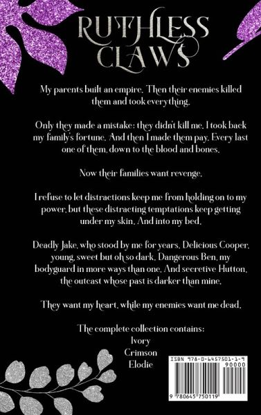 My parents built an empire. Then their enemies killed them and took everything. Only they made a mistake; they didn't kill me. I took back my family's fortune. And then I made them pay. Every last one of them, down to the blood and bones. Now their families want revenge. I refuse to let distractions keep me from holding on to my power, but these distracting temptations keep getting under my skin. And into my bed. Deadly Jake, who stood by me for years. Delicious Cooper, young, sweet but oh so dark. Dangerous Ben, my bodyguard in more ways than one. And secretive Hutton, the outcast whose past is darker than mine. They want my heart, while my enemies want me dead. The complete collection contains: Ivory Crimson Elodie