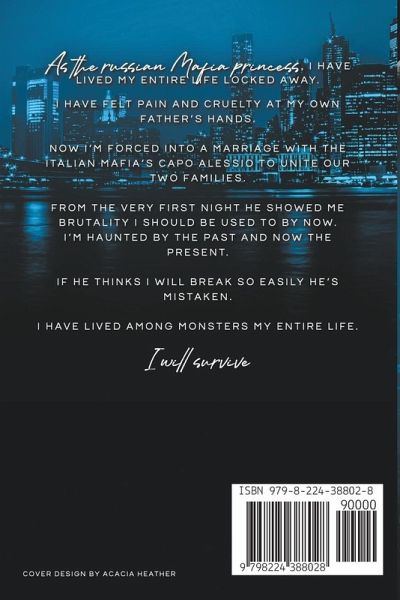 As the Russian Mafia princess, I have lived my entire life locked away. I have felt pain and cruelty at my own father's hands. Now I'm forced into a marriage with the Italian Mafia's Capo Alessio to unite our two families. From the very first night he showed me brutality I should be used to by now. I'm haunted by the past and now the present. If he thinks I will break so easily he's mistaken. I have lived among monsters my entire life. I will survive.