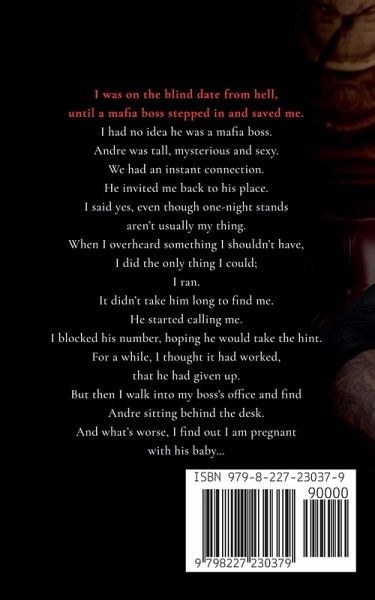 I was on the blind date from hell, until a mafia boss stepped in and saved me. I had no idea he was a mafia boss. Andre was tall, mysterious and sexy. We had an instant connection. He invited me back to his place. I said yes, even though one-night stands aren't usually my thing. When I overheard something I shouldn't have, I did the only thing I could; I ran. It didn't take him long to find me. He started calling me. I blocked his number, hoping he would take the hint. For a while, I thought it had worked, that he had given up. But then I walk into my boss's office and find Andre sitting behind the desk. And what's worse, I find out I am pregnant with his baby...