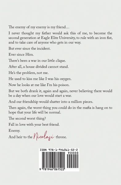 A mafia romance about best friends turned enemies by Rachel Van Dyken, the number one New York Times bestselling author of the Eagle Elite series. The enemy of my enemy is my friend...I never thought my father would ask this of me, to become the second generation at Eagle Elite University, to rule with an iron fist, and to take care of anyone who gets in our way.But ever since the incident.Ever since Him.There's been a war in our little clique.After all, a house divided cannot stand.He's the problem, not me.He used to kiss me like I was his oxygen.Now he looks at me like I'm his poison.But we both drank it, again and again, never believing there would be a day when our love would start a war.And our friendship would shatter into a million pieces.Then again, the worst thing you could do in the mafia is hang on to hope that your life will be normal.The second worst thing?Fall in love with your best friend.Enemy.And heir to the Nicolasi throne.