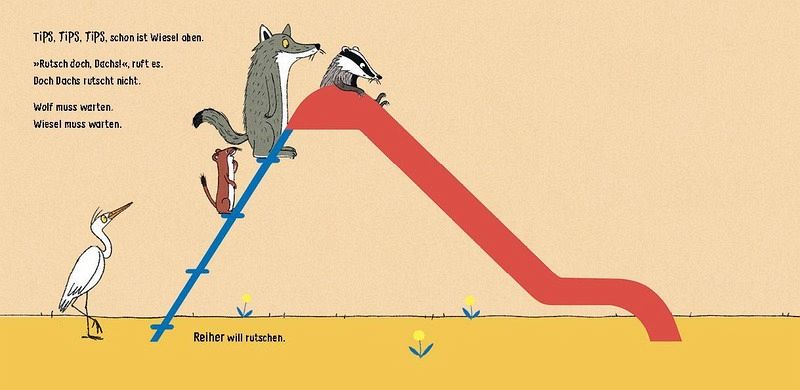 Dachs will rutschen. Tap, tap, tap, tap, tap, schon ist er oben. Oh, ist das hoch! Dachs rutscht nicht. Wie Susanne Straßer ihren ängstlichen Dachs oben auf die Rutsche setzt, wie sie die Tiere aller Gewichtsklassen die Leiter hinauf stapfen, tipsen, staksen und geduldig warten lässt, und wie der lustige Zoo schließlich doch ins Rutschen kommt - das ist echtes Spielplatzleben, hinreißend inszeniert für die Kleinsten!- Spielplatzgeschichte, Pappbilderbuch ab 2 - lustig und nah am Erleben der Jüngsten- einfache Dramaturgie, liebevoll und einfallsreich illustriert- Vorlesespaß durch Wiederholung und Lautmalerei