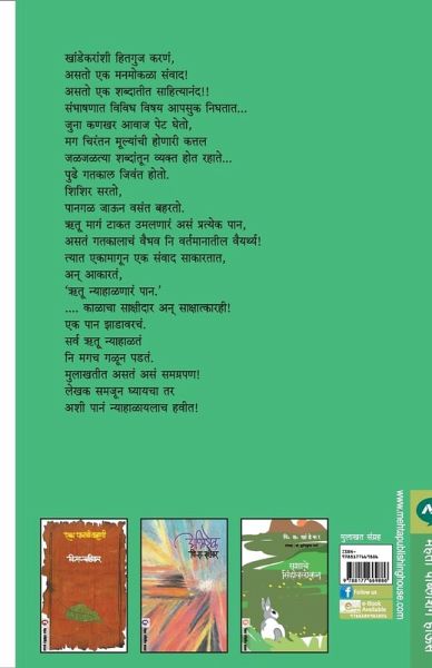 'RUTU NYAHALNARE PAAN' IS A COLLECTION OF INTERVIEWS OF V.S.KHANDEKAR. THESE INTERVIEWS ARE TAKEN DURING 1935 TO 1976 WHICH WAS WRITING PERIOD OF KHANDEKAR. IT CONTAINS INTERVIEWS TAKEN BY MAGAZINES LIKE 'VIHANGAM' & 'SAMARTH'. THIS COLLECTION COVERS ALMOST FOUR DECADES & WIDE RANGE OF VIEWS OF KHANDEKAR EXPRESSED IN VARIOUS INTERVIEWS.