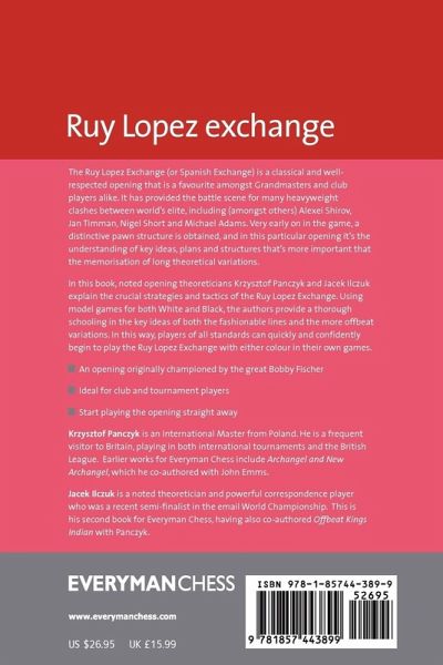 The Ruy Lopez Exchange (or Spanish Exchange) is a classical and well-respected opening that is a favorite among Grandmasters and club players alike. It has provided the battle scene for many heavyweight clashes between the world's elite players, including (among others) Alexei Shirov, Jan Timman, Nigel Short, and Michael Adams. Very early on in the game, a distinctive pawn structure is obtained, and in this particular opening it's the understanding of key ideas, plans, and structures that's more important than the memorization of long theoretical variations. In this book, noted opening theoreticians Krzysztof Panczyk and Jacek Ilczuk explain the crucial strategies and tactics of the Ruy Lopez Exchange. Using model games for both White and Black, the authors provide a thorough schooling in the key ideas of both the fashionable lines and the more offbeat variations. In this way, players of all standards can quickly and confidently begin to play the Ruy Lopez Exchange with either color in their own games. >An opening originally championed by the great Bobby Fischer >Ideal for club and tournament players >Provides readers with everything they need to know to start playing the opening