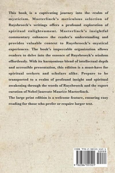This book is a captivating journey into the realm of mysticism. Maeterlinck's meticulous selection of Ruysbroeck's writings offers a profound exploration of spiritual enlightenment. Maeterlinck's insightful commentary enhances the reader's understanding and provides valuable context to Ruysbroeck's mystical experiences. The book's impeccable organization allows readers to delve into the essence of Ruysbroeck's wisdom effortlessly. With its harmonious blend of intellectual depth and accessible presentation, this edition is a must-have for spiritual seekers and scholars alike. Prepare to be transported to a realm of profound insight and spiritual awakening through the words of Ruysbroeck and the expert curation of Nobel laureate Maurice Maeterlinck. The large print edition is a welcome feature, ensuring easy reading for those who prefer or require larger text. "This volume is a collection of brief but pregnant chapters, written in sweet, simple English which is full of consolation and drops gently into the reader's heart. We give the book our warm commendation and believe that it has a mission of comfort to perform for burdened souls."-New York Independent.