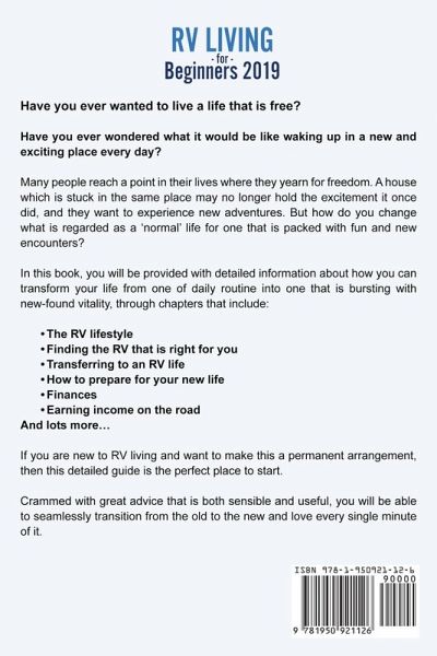 Have you ever wanted to live a life that is free? Have you ever wondered what it would be like waking up in a new and exciting place every day? Many people reach a point in their lives where they yearn for freedom. A house which is stuck in the same place may no longer hold the excitement it once did, and they want to experience new adventures. But how do you change what is regarded as a ‘normal’ life for one that is packed with fun and new encounters? In this book, you will be provided with detailed information about how you can transform your life from one of daily routine into one that is bursting with new-found vitality, through chapters that include: The RV lifestyle Finding the RV that is right for you Transferring to an RV life How to prepare for your new life Finances Earning income on the road And lots more… If you are new to RV living and want to make this a permanent arrangement, then this detailed guide is the perfect place to start. Crammed with great advice that is both sensible and useful, you will be able to seamlessly transition from the old to the new and love every single minute of it. Get a copy today and start living free!