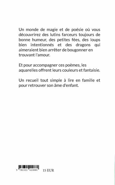 Un monde de magie et de poésie où vous découvrirez des lutins farceurs toujours de bonne humeur, des petites fées, des loups bien intentionnés et des dragons qui aimeraient bien arrêter de bougonner en trouvant l'amour.Et pour accompagner ces poèmes, les aquarelles offrent leurs couleurs et fantaisie.Un recueil tout simple à lire en famille et pour retrouver son âme d'enfant.