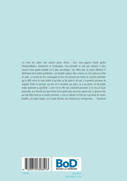 Les rêves des autres sont souvent pleins d'excès ; leurs extra-vagances frisent parfois l'invraisemblance, notamment en Psychanalyse. Ceux présentés ici sont, par contraste, le plus souvent d'une grande banalité sur le plan anecdotique ; des reflets plus ou moins déformés et déformants de la réalité quotidienne. Leur banalité surpasse dans certains cas celle qu'on vit à l'état de veille. Le ressenti du rêve, extravagant ou non, n'en présente pas moins un caractère particulier qui le diffé-rencie de toute réalité et qui tient au fait qu'on le vit seul, à la première personne du singulier. Tenter de partager son rêve en le racontant aux autres, ou à soi-même, lui fait perdre instan-tanément sa spécificité. Le rêve est en effet non seulement personnel, il est vécu de façon ponctuelle, une étincelle au coeur même de la matière grise du rêveur quand celui-ci, plusieurs fois par nuit, frôle l'éveil ou se réveille carrément. Le rêve ne subsiste en l'état que sous forme de courtes bouffées, des bulles fragiles sur le point d'éclater, des réminiscences intempestives... Remémoré (réinventé ?) en long, en large et en détails, délayé dans les quatre dimensions du monde réel, l'essence du rêve se dilue immanquablement. Couchés comme ils le sont dans les deux dimensions de la page d'écriture, et parfois plusieurs pages successives, les présents rêves ont perdu leur parfum, leur saveur, leur "flaveur" d'origine. D'où le sous-titre qui leur est accordé en compensation : "Contes à dormir debout"... C'est toujours mieux que rien.