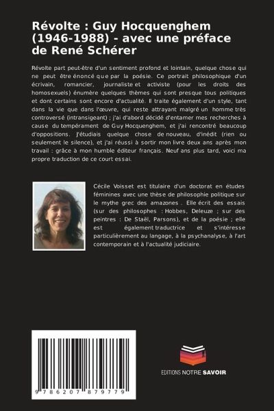 Révolte part peut-être d'un sentiment profond et lointain, quelque chose qui ne peut être énoncé que par la poésie. Ce portrait philosophique d'un écrivain, romancier, journaliste et activiste (pour les droits des homosexuels) énumère quelques thèmes qui sont presque tous politiques et dont certains sont encore d'actualité. Il traite également d'un style, tant dans la vie que dans l'oeuvre, qui reste attrayant malgré un homme très controversé (intransigeant) ; j'ai d'abord décidé d'entamer mes recherches à cause du tempérament de Guy Hocquenghem, et j'ai rencontré beaucoup d'oppositions. J'étudiais quelque chose de nouveau, d'inédit (rien ou seulement le silence), et j'ai réussi à sortir mon livre deux ans après mon travail : grâce à mon humble éditeur français. Neuf ans plus tard, voici ma propre traduction de ce court essai.