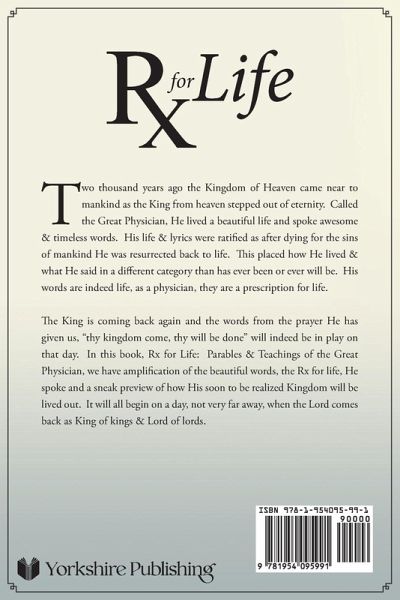 Two thousand years ago the Kingdom of Heaven came near to mankind as the King from heaven stepped out of eternity. Called the Great Physician, He lived a beautiful life and spoke awesome and timeless words. His life and lyrics were ratified as after dying for the sins of mankind He was resurrected back to life. This placed how He lived and what He said in a different category than has ever been or ever will be. His words are indeed life, as a physician, they are a prescription for life. The King is coming back again and the words from the prayer He has given us, "thy kingdom come, thy will be done" will indeed be in play on that day. In this book, Rx for Life: Parables and Teachings of the Great Physician, we have amplification of the beautiful words, the Rx for life, He spoke and a sneak preview of how His soon to be realized Kingdom will be lived out. It will all begin on a day, not very far away, when the Lord comes back as King of kings and Lord of lords.