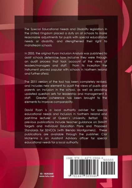 In 2005, the original Inclusion Analysis was published to assist schools determine how inclusive they were through an audit process that took account of the views of leaders/managers and staff. From its inception the instrument proved popular with schools in Northern Ireland and further afield. The 2011 version of the tool has been completely revised, and includes a new element to audit the views of pupils on inclusion in their school, and providing updated question sets for leadership and management & staff. Greater coherence has been brought to the elements to improve comparability. David Ryan is a local authority adviser for special educational needs and inclusion in Northern Ireland and part-time lecturer at Queen's University, Belfast. His previous publications include teacher guidance on SMART Targets and Individual Education Plans and proposed standards for SENCOs (with Brenda Montgomery). Clar McKenna is an assistant advisory officer for special educational needs for a local authority.