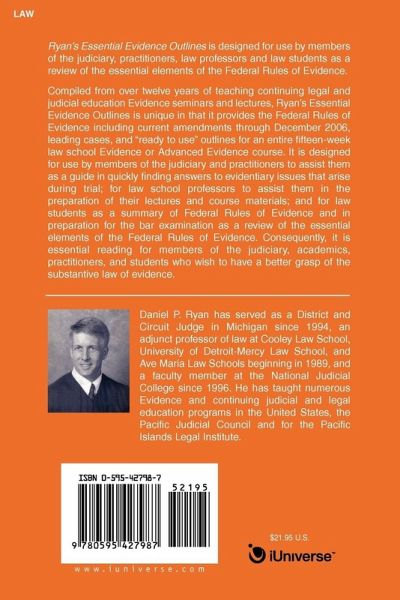 Ryan's Essential Evidence Outlines is designed for use by members of the judiciary, practitioners, law professors and law students as a review of the essential elements of the Federal Rules of Evidence. Compiled from over twelve years of teaching continuing legal and judicial education Evidence seminars and lectures, Ryan's Essential Evidence Outlines is unique in that it provides the Federal Rules of Evidence including current amendments through December 2006, leading cases, and "ready to use" outlines for an entire fifteen-week law school Evidence or Advanced Evidence course. It is designed for use by members of the judiciary and practitioners to assist them as a guide in quickly finding answers to evidentiary issues that arise during trial; for law school professors to assist them in the preparation of their lectures and course materials; and for law students as a summary of Federal Rules of Evidence and in preparation for the bar examination as a review of the essential elements of the Federal Rules of Evidence. Consequently, it is essential reading for members of the judiciary, academics, practitioners, and students who wish to have a better grasp of the substantive law of evidence.