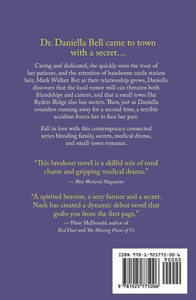 Dr. Daniella Bell came to town with a secret. Caring and dedicated, she quickly wins the trust of her patients, and the attention of handsome cattle station heir, Mark Walker. But as their relationship grows, Daniella discovers that the local rumor mill can threaten both friendships and careers, and that a small town like Ryders Ridge also has secrets. Then, just as Daniella considers running away for a second time, a terrible accident forces her to face her past. Fall in love with this contemporary connected series blending family, secrets, medical drama, and small-town romance. "This breakout novel is a skilful mix of rural charm and gripping medical drama." - West Weekend Magazine "A spirited heroine, a sexy farmer and a secret. Nash has created a dynamic debut novel that grabs you from the first page." - Fleur McDonald, author of Red Dust and The Missing Pieces of Us