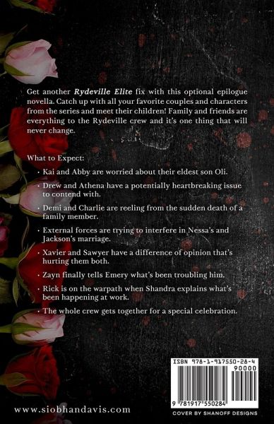 Get another Rydeville Elite fix with this optional epilogue novella. Catch up with all your favorite couples and characters from the series and meet their children! Family and friends are everything to the Rydeville crew and it's one thing that will never change. What to Expect:Kai and Abby are worried about their eldest son Oli. Drew and Athena have a potentially heartbreaking issue to contend with. Demi and Charlie are reeling from the sudden death of a family member. External forces are trying to interfere in Nessa's and Jackson's marriage. Xavier and Sawyer have a difference of opinion that's hurting them both. Zayn finally tells Emery what's been troubling him. Rick is on the warpath when Shandra explains what's been happening at work. The whole crew gets together for a special celebration. Find out everything that is going down in this multi-POV novella. 35k words and 14 chapters.
