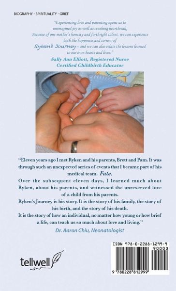 "Experiencing love and parenting opens us to unimagined joy as well as crushing heartbreak. Because of one mother's honesty and forthright talent, we can experience both the happiness and sorrow of Ryken's Journey - and we can also relate the lessons learned to our own hearts and lives." Sally Ann Elliot, Registered Nurse Certified Childbirth Educator. "Eleven years ago I met Ryken and his parents, Brett and Pam. It was through such an unexpected series of events that I became part of his medical team. Fate. Over the subsequent eleven days, I learned much about Ryken, about his parents, and witnessed the unreserved love of a child from his parents. Ryken's Journey is his story. It is the story of his family, the story of his birth, and the story of his death. It is the story of how an individual, no matter how young or how brief a life, can teach us so much about love and living." Dr. Aaron Chiu, Neonatologist