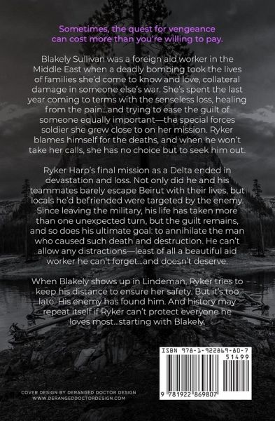 Sometimes, the quest for vengeance can cost more than you're willing to pay. Blakely Sullivan was a foreign aid worker in the Middle East when a deadly bombing took the lives of families she'd come to know and love, collateral damage in someone else's war. She's spent the last year coming to terms with the senseless loss, healing from the pain...and trying to ease the guilt of someone equally important-the special forces soldier she grew close to on her mission. Ryker blames himself for the deaths, and when he won't take her calls, she has no choice but to seek him out. Ryker Harp's final mission as a Delta ended in devastation and loss. Not only did he and his teammates barely escape Beirut with their lives, but locals he'd befriended were targeted by the enemy. Since leaving the military, his life has taken more than one unexpected turn, but the guilt remains, and so does his ultimate goal: to annihilate the man who caused such death and destruction. He can't allow any distractions-least of all a beautiful aid worker he can't forget...and doesn't deserve. When Blakely shows up in Lindeman, Ryker tries to keep his distance to ensure her safety. But it's too late. His enemy has found him. And history may repeat itself if Ryker can't protect everyone he loves most...starting with Blakely.