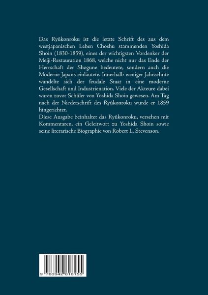Das Ryûkonroku, was sich ungefähr mit den Aufzeichnungen eines innehaltenden Herzens oder - oft im Englischen verwendet - A Soulful Minute - übersetzen lässt, ist die letzte Schrift des geistigen Vordenkers der Meiji-Restauration in Japan 1868 Yoshida Shoin. Am Tag nach der Niederschrift wurde er 1859 hingerichtet. Diese Ausgabe beinhaltet das Ryûkonroku, versehen mit Kommentaren, ein Geleitwort zu Yoshida Shoin sowie seine literarische Biographie von Robert L. Stevenson.