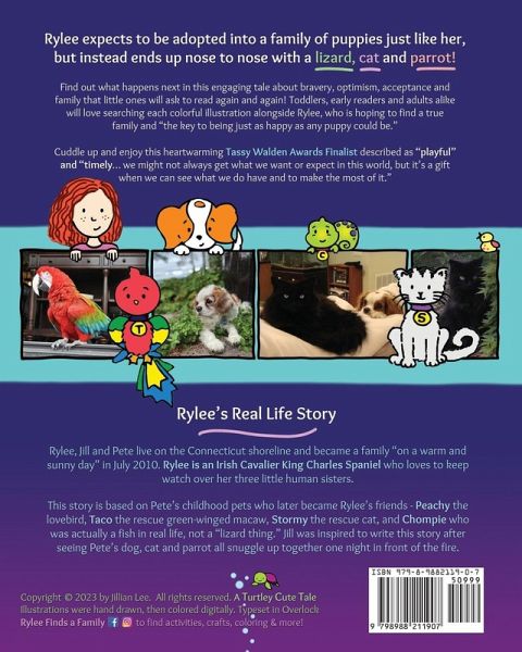 Rylee expects to be adopted into a family of puppies just like her, but instead is surprised to end up nose to nose with a lizard, cat and parrot! Find out what happens next in this engaging book about bravery, optimism, acceptance and family that little ones will ask to read again and again. Tassy Walden Awards Finalist in 2022 for New Voices in Children's Literature. Toddlers, early readers and adults alike will love searching each colorful illustration alongside Rylee, who is hoping to find a true family and "the key to being just as happy as any puppy could be." Cuddle up and enjoy this heartwarming rhyming story described as "playful... inviting readers in with its humorous touches and animal expressions" and "timely... we might not always get what we want or expect in this world, but it's a gift when we can see what we do have and to make the most of it." "Rylee Finds a Family" is perfect for:Pet and animal book lovers everywhere! Toddlers and preschoolers who love first look and find, seek and find or search and find type books! A bedtime favorite or goodnight book for kids! A gift for new or early readers! A gift for new puppy, dog, cat, bird, lizard or pet owners! Cavalier King Charles Spaniel puppy and book lovers! Parents looking for a fun read! Children ages 1-8!