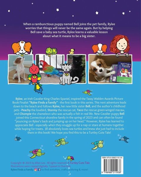 From the Author-Illustrator of Rylee Finds a Family (2022 Tassy Walden Award Finalist), comes an adorable rhyming tale about family and what it means to be a big sister. An interactive read aloud that features hidden sea turtles to find throughout the story, sea turtle facts and a character craft activity! Join Rylee and her new puppy sister Bell on an engaging and interactive journey down to the beach. Toddlers, early readers and adults alike will love searching the colorful illustrations for hidden sea turtles, butterflies and members of Rylee's pet family which include a parrot, cat, chameleon and lovebird. Ideal for children aged 1-8, this heartwarming story celebrates families helping one another and everything that comes with having a little sibling. Bonus Features: the book includes a character craft activity to color, cutout and complete, as well as sea turtle facts with messaging about recycling and doing our part to protect the oceans, in addition to the hidden sea turtles to find throughout the story. Makes a great gift for kids ages: 1, 2, 3, 4, 5, 6, 7, 8 and grades K-2 Book Summary: When a rambunctious puppy named Bell joins the pet family, Rylee worries that things will never be the same again. But by helping Bell save a baby sea turtle, Rylee learns a valuable lesson about what it means to be a big sister. About the pets in real life: Rylee, an Irish Cavalier King Charles Spaniel, inspired the Tassy Walden Awards Picture Book Finalist "Rylee Finds a Family" - the first book in this series. This next adventure leads down to the beach and follows Rylee, her new little sister Bell, and the author's childhood pets - Peachy the lovebird, Stormy the rescue cat, Taco the rescue green-winged macaw, and Chompie the chameleon who was actually a fish in real life. New Cavalier puppy Bell joined this Connecticut shoreline family in the spring of 2023 and can often be found "pouncing on Rylee's back and jumping up on her head." However, Rylee has learned to appreciate Bell - especially when they snuggle up for a nap or stare at humans together while hoping for treats. Jill absolutely loves sea turtles and knew she just had to include them in this book! We hope you find this to be a Turtley Cute Tale! "Rylee Helps a Family: a sea turtle and puppy tale" is perfect for:Pet, animal, sea turtle, dog and puppy tales book lovers everywhere! Toddlers and preschoolers who love first look and find, seek and find or search and find type picture books! A bedtime favorite or goodnight book for toddlers and kids! A gift for new or early readers! A gift for new puppy, dog, cat, bird, lizard, chameleon, turtle or pet owners! A gift for new big sisters and big brothers! Cavalier King Charles Spaniel puppy and book lovers! Beach and sea turtle lovers! Parents looking for a fun rhyming read! Fans of Dav Pilkey's Dragon series (which have always inspired Jillian) Birthday and Holiday gifts including Christmas and Easter Children and kids ages 1-8!