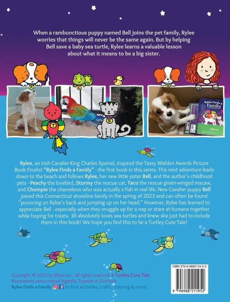 From the Author-Illustrator of Rylee Finds a Family (2022 Tassy Walden Award Finalist), comes an adorable rhyming tale about family and what it means to be a big sister. An interactive read aloud that features hidden sea turtles to find throughout the story and sea turtle facts! Join Rylee and her new puppy sister Bell on an engaging and interactive journey down to the beach. Toddlers, early readers and adults alike will love searching the colorful illustrations for hidden sea turtles, butterflies and members of Rylee's pet family which include a parrot, cat, chameleon and lovebird. Ideal for children aged 1-8, this heartwarming story celebrates families helping one another and everything that comes with having a little sibling. Bonus Features: the book includes sea turtle facts with messaging about recycling and doing our part to protect the oceans, in addition to the hidden sea turtles to find throughout the story. Makes a great gift for kids ages: 1, 2, 3, 4, 5, 6, 7, 8 and grades K-2 Book Summary: When a rambunctious puppy named Bell joins the pet family, Rylee worries that things will never be the same again. But by helping Bell save a baby sea turtle, Rylee learns a valuable lesson about what it means to be a big sister. About the pets in real life: Rylee, an Irish Cavalier King Charles Spaniel, inspired the Tassy Walden Awards Picture Book Finalist "Rylee Finds a Family" - the first book in this series. This next adventure leads down to the beach and follows Rylee, her new little sister Bell, and the author's childhood pets - Peachy the lovebird, Stormy the rescue cat, Taco the rescue green-winged macaw, and Chompie the chameleon who was actually a fish in real life. New Cavalier puppy Bell joined this Connecticut shoreline family in the spring of 2023 and can often be found "pouncing on Rylee's back and jumping up on her head." However, Rylee has learned to appreciate Bell - especially when they snuggle up for a nap or stare at humans together while hoping for treats. Jill absolutely loves sea turtles and knew she just had to include them in this book! We hope you find this to be a Turtley Cute Tale! "Rylee Helps a Family: a sea turtle and puppy tale" is perfect for:Pet, animal, sea turtle, dog and puppy tales book lovers everywhere! Toddlers and preschoolers who love first look and find, seek and find or search and find type picture books! A bedtime favorite or goodnight book for toddlers and kids! A gift for new or early readers! A gift for new puppy, dog, cat, bird, lizard, chameleon, turtle or pet owners! A gift for new big sisters and big brothers! Cavalier King Charles Spaniel puppy and book lovers! Beach and sea turtle lovers! Parents looking for a fun rhyming read! Fans of Dav Pilkey's Dragon series (which have always inspired Jillian) Birthday and Holiday gifts including Christmas and Easter Children and kids ages 1-8!