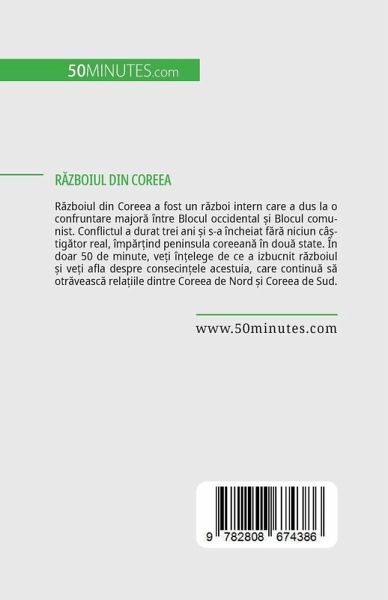 R¿zboiul din Coreea a fost un r¿zboi intern care a dus la o confruntare major¿ între Blocul occidental ¿i Blocul comunist. Conflictul a durat trei ani ¿i s-a încheiat f¿r¿ niciun câ¿tig¿tor real, împ¿r¿ind peninsula coreean¿ în dou¿ state. În doar 50 de minute, ve¿i în¿elege de ce a izbucnit r¿zboiul ¿i ve¿i afla despre consecin¿ele acestuia, care continu¿ s¿ otr¿veasc¿ reläiile dintre Coreea de Nord ¿i Coreea de Sud. Aceast¿ carte simpl¿ ¿i informativ¿ ofer¿ o discu¿ie am¿nun¿it¿ a momentelor cheie ale sângerosului r¿zboi, inclusiv decizia lui Kim Il-sung de a ataca Coreea de Sud, evolu¿ia conflictului ¿i impasul care a urmat. Include, de asemenea, o biografie complet¿ a figurilor cheie ale conflictului, inclusiv a lui Syngman Rhee ¿i Douglas MacArthur, o introducere valoroas¿ în contextul politic, social ¿i economic ¿i o evaluare a consecin¿elor r¿zboiului, oferindu-v¿ toate informäiile esen¿iale despre aceast¿ perioad¿ important¿ din istoria Coreei.