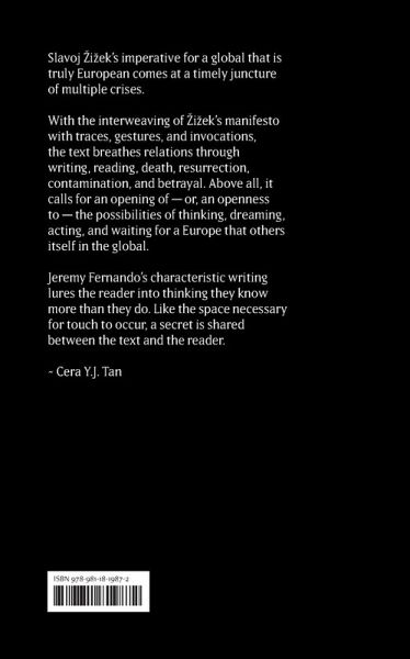 This book opens with a provocation by Slavoj iek to cut ourselves off from the decaying corpse of the old Europe in order to keep the European legacy alive . Which is not an attempt to merely cherry-pick good features over bad ones, but an argument that the main reason to stay with the name Europe , to keep a certain faith in Europe , is the fact the that European legacy provides the best critical instruments to analyze what went wrong, has been going awry, in Europe. It is nothing other than a challenge for us to imagine, perhaps even conceive - give birth to in the precise sense of manifest - the possibility of a Europe that acts in a global way that is not focused on Europe. It is followed by a reading of his manifesto by Jeremy Fernando - who performs a reading which tries never to forget that what is being read is a manifesto, has been called, entitled, is named, A European Manifesto . For, names name possibilities. And a manifesto is a text, and like every text, comes with its particularities, its inherent specificities: and, in its case, foregrounds the fact that it manifests itself, shows itself, stages (theoria) itself. Puts itself on a stage whilst fully aware of the fact that it is staging itself. Thus, always also brings with it the question, what is the effect of a manifesto?, alongside its compendium, how does one read a manifesto? Which is not to say that reading is passive, and that the one who reads has nothing to do with what is being read. For, as Paul de Man continues to teach us, not that the act of reading is innocent: far from it. It is the starting point of all evil ; where, reading not only resounds with echoes of the primordial question, rings with potentially unanswerable questions, but might well be a quest that continually writes itself into us. Nor devoid of risk. For in attempting to attend to a text, in opening oneself to the possibilities of a text, one risks the possibility of falling, along with all the potential disasters this entails, in love; that is, of seeing, of being in, the world no longer from the perspective of the One but from the perspective of Two (Alain Badiou). That in reading, not only is one bringing forth certain potentials of and in a text, but that one opens oneself to the text writing itself onto oneself, manifesting itself in one's very self. And where there is the possibility that an attempt to read Europe , even as one might be trying to be as critical of it as possible, even if one is maintaining a distance from it, keeping a gap from what one has named Europe , in reading one has opened oneself to being called by Europe - summoned by spectres of a Europe that we might not even think, realise, imagine, we are reading - being shaped by Europe into becoming European , whatever that may even begin to mean...