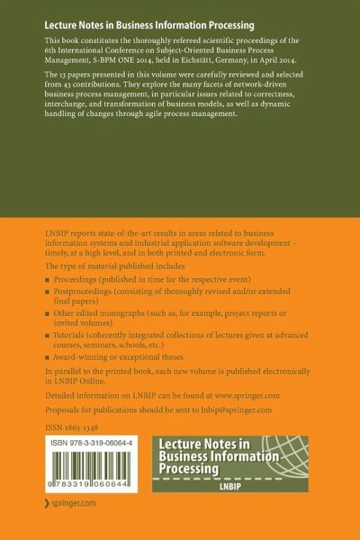 This book constitutes the thoroughly refereed scientific proceedings of the 6th International Conference on Subject-Oriented Business Process Management, S-BPM ONE 2014, held in Eichstätt, Germany, in April 2014. The 13 papers presented in this volume were carefully reviewed and selected from 43 contributions. They explore the many facets of network-driven business process management, in particular issues related to correctness, interchange and transformation of business models, as well as dynamic handling of changes through agile process management.