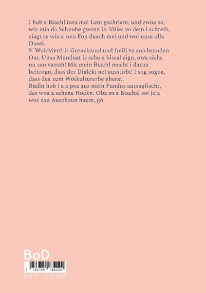 I hob a Biachl üwa mei Lem gschriem, und zwoa so, wia mia da Schnobe gwoxn is. Vüles vo dem i schreib, ziagt se wia a rota Fon duach mei und woi unsa olla Dosei. S¿Woidviertl is Grenzlaund und freili va ana bsundan Oat. Unsa Mundoat is scho a bissal eign, owa sicha nu zan vasteh! Mit mein Biachl mecht i dazua beitrogn, dass der Dialekt net ausstirbt! I sog sogoa, dass dea zum Wötkulturerbe gherat. Büdln hob i a a poa aus mein Fundus aussagfischt, des woa a schene Hockn. Oba so a Biachal soi jo a wos zan Auschaun haum, gö.