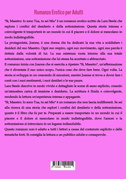 "Sì, Maestro: Io sono Tua, tu sei Mio" è un romanzo erotico scritto da Lara Steele che esplora i confini del desiderio e della sottomissione. Questa storia intensa e coinvolgente ti trasporterà in un mondo in cui il piacere e il dolore si mescolano in modo indistinguibile.La protagonista, Joanne, è una donna che ha dedicato la sua vita a soddisfare i desideri del suo Maestro. Ogni suo respiro, ogni suo movimento, ogni sua parola è dettata dalla volontà di lui. La sua esistenza ruota intorno alla sua totale sottomissione, una sottomissione che lei stessa ha accettato e abbracciato.Il romanzo inizia con Joanne che si esercita a ripetere "Sì, Maestro", un'affermazione che è diventata il suo unico scopo, l'unica cosa che deve fare bene. Ogni volta. La storia si sviluppa in un crescendo di emozioni, mentre Joanne si trova a dover fare i conti con i suoi sentimenti, i suoi desideri e le sue paure.Lara Steele descrive in modo vivido e dettagliato le scene di sesso esplicito, creando un'atmosfera carica di tensione e desiderio. La scrittura è fluida e coinvolgente, rendendo la lettura un'esperienza intensa e appagante."Sì, Maestro: Io sono Tua, tu sei Mio" è un romanzo che non lascia indifferenti. Se sei alla ricerca di una storia che esplori i confini del desiderio e della sottomissione, questo è il libro che fa per te. Preparati a essere trasportato in un mondo in cui il piacere e il dolore si mescolano in modo indistinguibile, dove l'amore e la sottomissione si intrecciano in un legame indissolubile.Questo romanzo non è adatto a tutti i lettori a causa del contenuto esplicito e delle tematiche forti. Si consiglia la lettura a un pubblico adulto e consapevole.