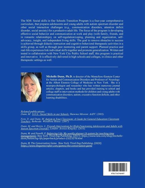 The SOS: Social skills in Our Schools Transition Program is a four-year comprehensive curriculum, that prepares adolescents and young adults with autism spectrum disorder and other social interaction challenges (e.g., communication disorders, attention deficit disorder, social anxiety) for a productive adult life. The focus of the program is developing effective social behavior and communication at work and play (with family, friends, and in romantic relationships), on self-regulation/coping, planning and organization, self-advocacy, insight, and independent living skills. The goal to remove obstacles to success is achieved through didactic instruction and cognitive behavioral therapeutic activities in a skills group, as well as through peer mentoring and parent support. Planned practice and real-life experiences link individual skills together and promote generalization. Written and tested in collaboration with New York City Public School staff, this program is practical and innovative. It is effectively delivered in high schools and colleges, in clinics and other therapeutic settings as well.