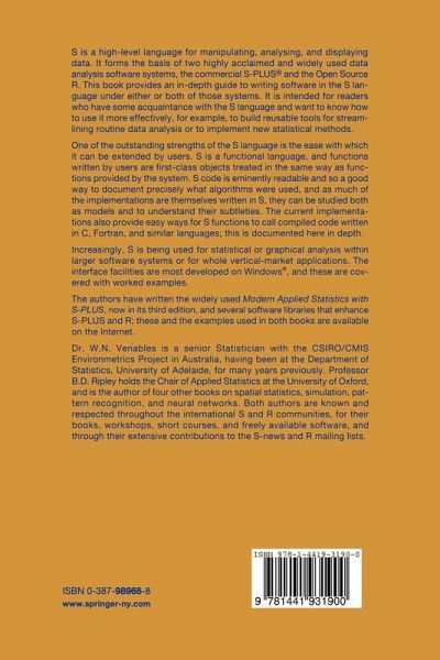 "Let me come right to the point. If you use S at all - either through the S-PLUS commercial software package or its free open software variant, R - get this book. It is a superbly written, indispensable resource to the S language. Whether you merely dabble in S/R (or are contemplating such dabbling) or are a seasoned veteran who uses it extensively, you will find [this book] invaluable...I would be remiss if I did not pay homage to what I consider a most welcome feature of this book: the superb quality of the writing and the remarkable attention to detail by both authors and publisher. V&R write clearly and very concisely; they take great care to explain what needs to be explained, but they do not patronize the reader with trivialities; they use many well chosen examples and code snippets to support their expositions; and they organize and sequence topics logically, and extensively and liberally cross-reference them by page number to help the reader understand how they relate. Finally, V&R frequently take pains to point out lurking software traps and documentation inaccuracies that can plague users. I consider such conscious efforts to mitigate future aggravations for readers a thoughtful courtesy that more software documenters should emulate. I also would like to compliment the publishers on the superb typography and page layout that clearly distinguishes text, code, tables, section headings, and so forth. The editing is also remarkable: I noticed no errors at all! This level of attention to production detail makes the book very easy to either browse or study. I appreciated it very much. In many respects, [this book] could serve as a model for what ought to be the standard in software references. It strikes a careful and effective balance between providing a big picture of the overall language structure and the details necessary to fit the pieces together and make themwork...It is written with attention to style and clarity and produced to help the reader grasp the content as easily as possible. Such details matter, and it is a pleasure to give credit where credit is clearly due. S PROGRAMMING should be on every S/R user's desk next to the computer, and maybe in every software documenter's library as well."