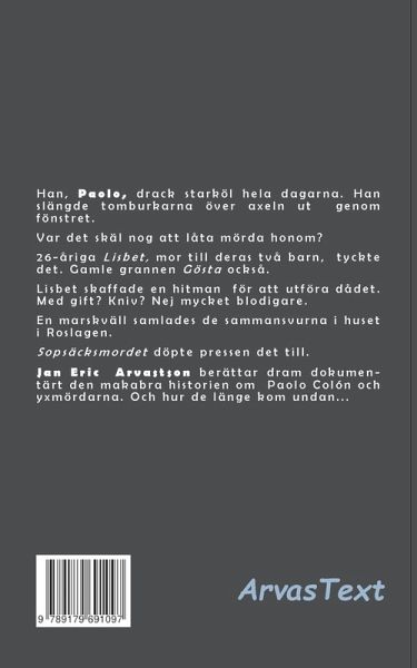 Han, Paolo, drack starköl hela dagarna. Han slängde tomburkarna över axeln ut genom fönstret. Var det skäl nog att låta mörda honom? 26-åriga Lisbet, mor till deras två barn, tyckte det. Gamle grannen Gösta också. Lisbet skaffade en hitman för att utföra dådet. Med gift? Kniv? Nej, mycket blodigare. En marskväll samlades de sammansvurna i huset i Roslagen. Sopsäcksmordet döpte pressen det till. Jan Eric Arvastson berättar dram dokumentärt den makabra historien om Paolo Colón och yxmördarna. Och hur de länge kom undan...