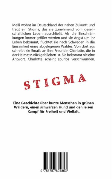 Melli wohnt im Deutschland der nahen Zukunft und trägt ein Stigma, das sie zunehmend vom gesellschaftlichen Leben ausschließt. Als die Einschränkungen immer größer werden und sie Angst um ihr Leben bekommt, flüchtet sie nach Schweden in die Einsamkeit eines abgelegenen Waldes. Von dort aus schreibt sie Emails an ihre Freundin Charlotte, die in der Heimat zurückgeblieben ist. Sie bekommt nie eine Antwort, Charlotte scheint spurlos verschwunden. Stigma - Eine Geschichte über bunte Menschen in grünen Wäldern, einen schwarzen Hund und den leisen Kampf für Freiheit und Vielfalt.