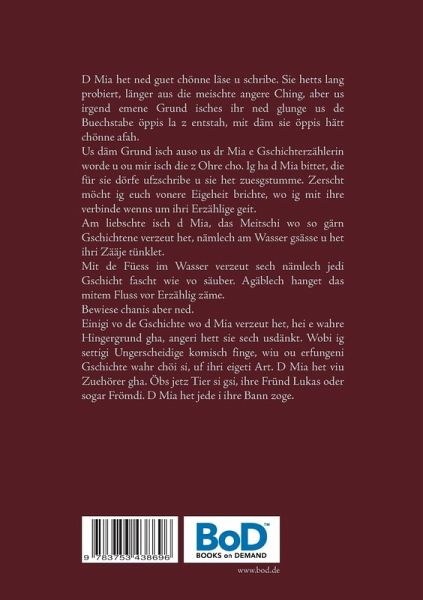 D Mia het ned guet chönne läse u schribe. Sie hetts lang probiert, länger aus die meischte angere Ching, aber us irgend emene Grund isches ihr ned glunge us de Buechstabe öppis la z entstah, mit däm sie öppis hätt chönne afah. Us däm Grund isch auso us dr Mia e Gschichterzählerin worde u ou mir isch die z Ohre cho. Ig ha d Mia bittet, die für sie dörfe ufzschribe u sie het zuesgstumme. Zerscht möcht ig euch vonere Eigeheit brichte, wo ig mit ihre verbinde wenns um ihri Erzählige geit. Am liebschte isch d Mia, das Meitschi wo so gärn Gschichtene verzeut het, nämlech am Wasser gsässe u het ihri Zääje tünklet. Mit de Füess im Wasser verzeut sech nämlech jedi Gschicht fascht wie vo säuber. Agäblech hanget das mitem Fluss vor Erzählig zäme. Bewiese chanis aber ned. Einigi vo de Gschichte wo d Mia verzeut het, hei e wahre Hingergrund gha, angeri hett sie sech usdänkt. Wobi ig settigi Ungerscheidige komisch finge, wiu ou erfungeni Gschichte wahr chöi si, uf ihri eigeti Art. D Mia het viu Zuehörer gha. Öbs jetz Tier si gsi, ihre Fründ Lukas oder sogar Frömdi. D Mia het jede i ihre Bann zoge.