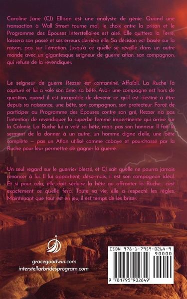 Caroline Jane (CJ) Ellison est une analyste de génie. Quand une transaction à Wall Street tourne mal, le choix entre la prison et le Programme des Épouses Interstellaires est aisé. Elle quittera la Terre, laissera son passé et ses erreurs derrière elle. Sa décision est basée sur la raison, pas sur l’émotion. Jusqu’à ce qu’elle se réveille dans un autre monde avec un gigantesque seigneur de guerre atlan, son compagnon, qui refuse de la revendiquer. Le seigneur de guerre Rezzer est contaminé. Affaibli. La Ruche l’a capturé et lui a volé son âme, sa bête. Avoir une compagne est hors de question, quand il est incapable de devenir ce qu’il est destiné à être depuis sa naissance, une bête, son compagnon, son protecteur. Forcé de participer au Programme des Épouses contre son gré, Rezzer n’a pas l’intention de revendiquer la superbe femme impertinente qui arrive sur la Colonie. La Ruche lui a volé sa bête, mais pas son honneur. Il fait le serment de la donner à un autre, un homme digne d’elle, une bête complète — pas un Atlan utilisé comme cobaye et pourchassé par la Ruche pour leur permettre de gagner la guerre. Un seul regard sur le guerrier blessé, et CJ sait qu’elle ne pourra jamais renoncer à lui. Il lui appartient, désormais, il est son compagnon idéal. Et si pour cela, elle doit séduire la bête ou affronter la Ruche... c’est exactement ce qu’elle fera. Toute sa vie, elle a respecté les règles. Maintenant que tout est en jeu, il est temps de les briser.