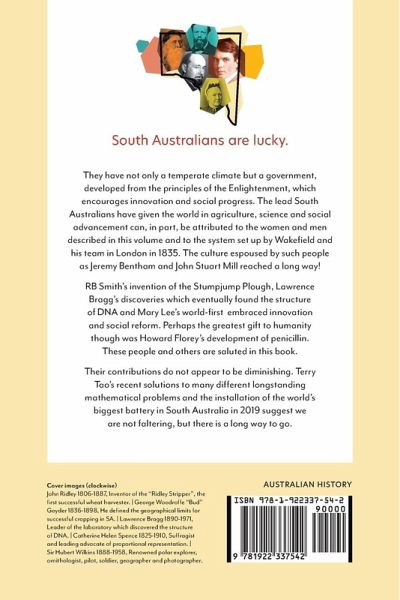 South Australians are lucky. They have not only a temperate climate but a government developed from the principles of the Enlightenment, which encourages innovation and social progress. The lead South Australians have given the world in agriculture, science and social advancement can, in part, be attributed to the women and men described in this volume and to the system set up by Wakefield and his team in London in 1835. The culture espoused by people such as Jeremy Bentham and John Stuart Mill reached a long way! RB Smith's invention of the Stumjump Plough, Lawrence Bragg's discoveries which eventually found the structure of DNA and Mary Lee's world-first embraced innovation and social reform. Perhaps the greatest gift to humanity though was Howard Florey's development of penicillin. These people and others are saluted in this book. Their contributions do not appear to be diminishing. Terry Tao's recent solutions to long-standing mathematical problems and the installation of the world's biggest battery in 2019 suggest we are not faltering, but there is a long way to go.