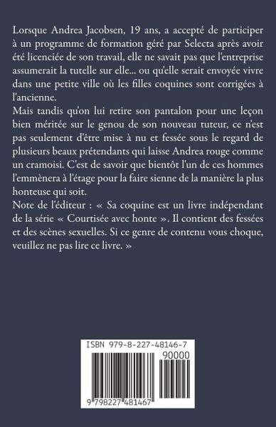 Lorsque Andrea Jacobsen, 19 ans, a accepté de participer à un programme de formation géré par Selecta après avoir été licenciée de son travail, elle ne savait pas que l'entreprise assumerait la tutelle sur elle... ou qu'elle serait envoyée vivre dans une petite ville où les filles coquines sont corrigées à l'ancienne. Mais tandis qu'on lui retire son pantalon pour une leçon bien méritée sur le genou de son nouveau tuteur, ce n'est pas seulement d'être mise à nu et fessée sous le regard de plusieurs beaux prétendants qui laisse Andrea rouge comme un cramoisi. C'est de savoir que bientôt l'un de ces hommes l'emmènera à l'étage pour la faire sienne de la manière la plus honteuse qui soit. Note de l'éditeur : Sa coquine est un livre indépendant de la série Courtisée avec honte . Il contient des fessées et des scènes sexuelles. Si ce genre de contenu vous choque, veuillez ne pas lire ce livre.