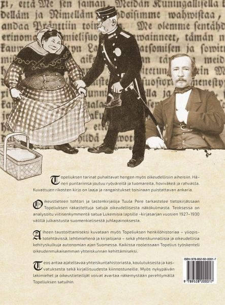 Topeliuksen tarinat puhaltavat hengen myös oikeudellisiin aiheisiin. Hänen puntariinsa joutuu ryöväreitä ja tuomareita, hoviväkeä ja rahvasta. Kuvattujen rikosten kirjo on laaja ja rangaistukset toisinaan puistattavan ankaria. Oikeustieteen tohtori ja lastenkirjailija Tuula Pere tarkastelee tietokirjassaan Topeliuksen rakastettuja satuja oikeudellisesta näkökulmasta. Teoksessa on analysoitu viitisenkymmentä satua Lukemisia lapsille -kirjasarjan vuosien 1927-1930 välillä julkaistusta suomenkielisestä juhlapainoksesta. Aiheen taustoittamiseksi kuvataan myös Topeliuksen henkilöhistoriaa - yliopistotehtävissä, lehtimiehenä ja kirjailijana - sekä yhteiskunnallisia ja oikeudellisia kehityskulkuja autonomian ajan Suomessa. Kaikissa rooleissaan Topelius työskenteli oikeudenmukaisemman yhteiskunnan kehittämiseksi. Teos antaa ajateltavaa yhteiskuntahistoriasta, koulutuksesta ja kasvatuksesta sekä kirjallisuudesta kiinnostuneille. Myös nykypäivän lakimiehet ja oikeustieteilijät voivat avartaa näkemystään perehtymällä Topeliuksen satuihin.